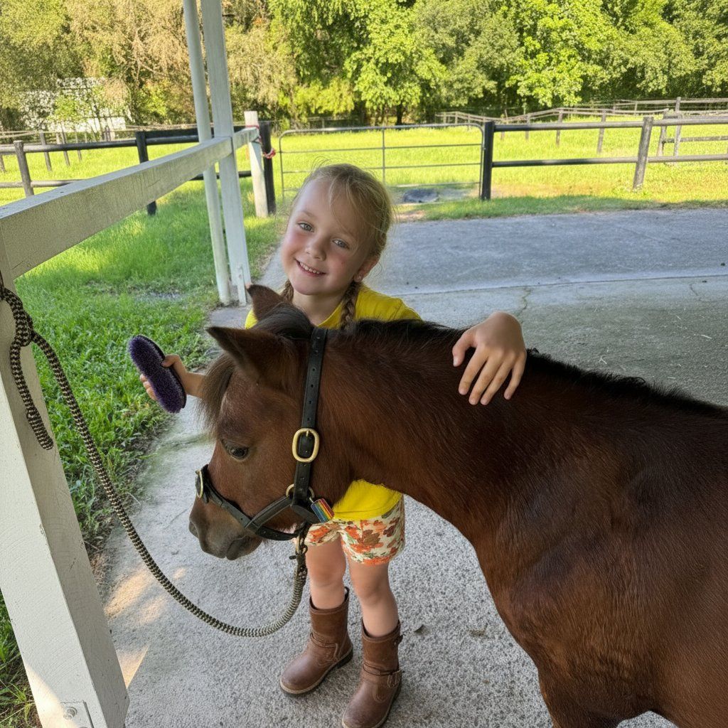 This is a non-riding program designed to teach children how to safely, calmly, and respectfully care for horses and other farm animals while developing confidence, responsibility, and emotional awareness.